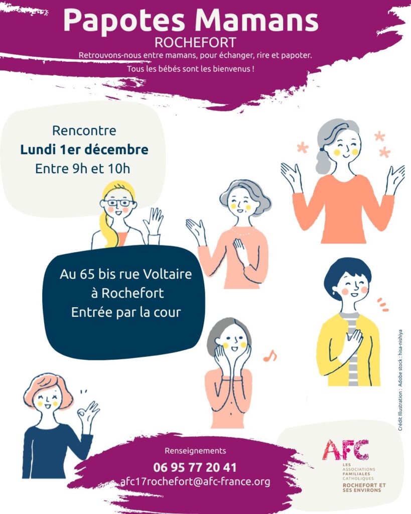 Pendant cette période de préparation à Noël, l’AFC Rochefort propose également les rencontres Papotes Mamans, destinées à toutes : jeunes mamans, futures mamans, mamans en pleine aventure parentale, et même les grand-mères !