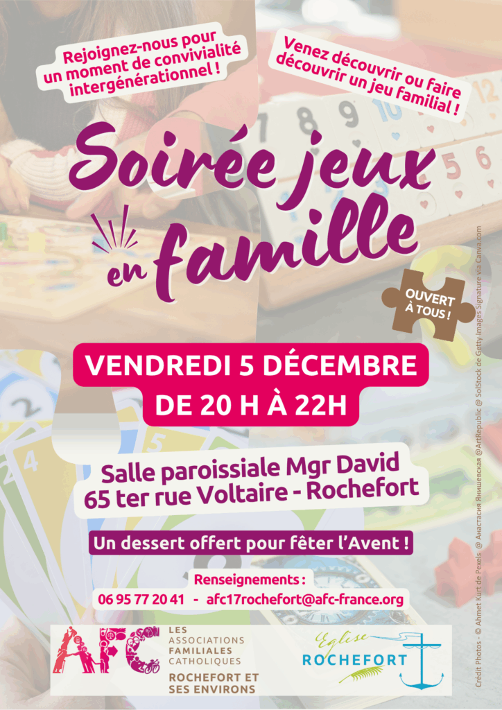 L’AFC Rochefort organise une soirée jeux en famille le vendredi 5 décembre, de 20h à 22h, à la salle paroissiale Monseigneur David de Rochefort.