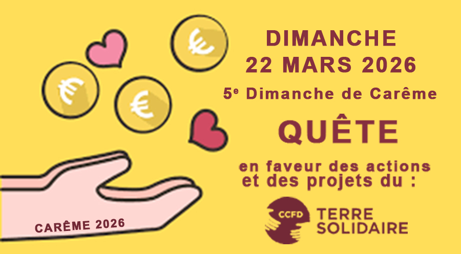 La traditionnelle QUÊTE DE CARÊME pour soutenir les projets et actions de solidarité portés par le CCFD-Terre Solidaire aura lieu le DIMANCHE 22 MARS 2026, 5ème dimanche de Carême, à la sortie des églises.