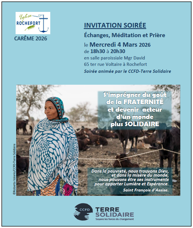 La traditionnelle QUÊTE DE CARÊME pour soutenir les projets et actions de solidarité portés par le CCFDTerre Solidaire aura lieu le DIMANCHE 22 MARS 2026, 5ème dimanche de Carême, à la sortie des églises.