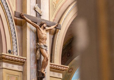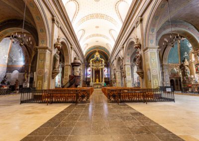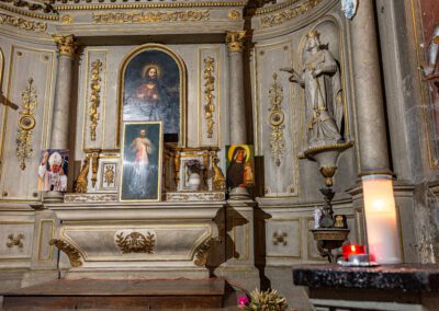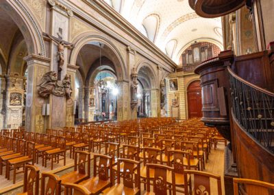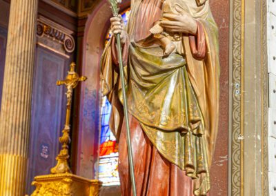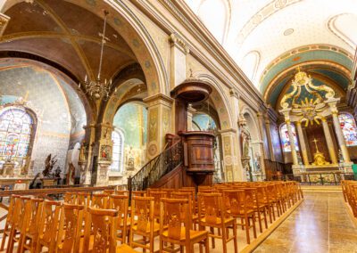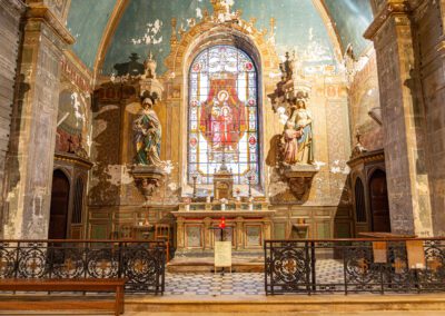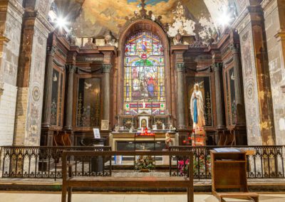 De style néo-classique, l’église se compose d’une nef centrale flanquée de chapelles latérales, avec une façade épurée. À l’intérieur, l’élévation sobre incite à l’intériorité, ponctuée par des vitraux aux teintes douces et un mobilier liturgique restauré avec soin.