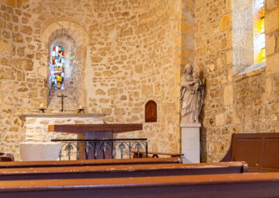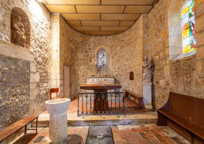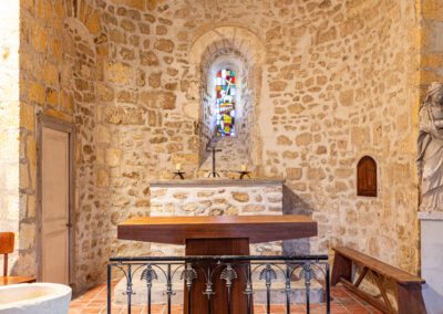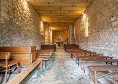 L’intérieur, baigné de lumière naturelle, dévoile une nef unique, des chapiteaux sculptés et une atmosphère sobre, empreinte de sérénité.